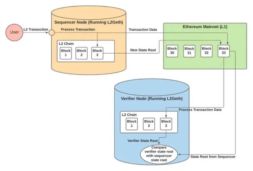无效证明可能包含着不正确的状态转换,因而会对涉及的验证者施加惩罚;随后状态回滚至最近的有效快照状态处,Rollup 合约跟踪状态根的整个历史记录和每个批次的哈希值。Optimistic Rollups 假设所有交易都是有效的,并且不经验证就将它们发布到基础层。