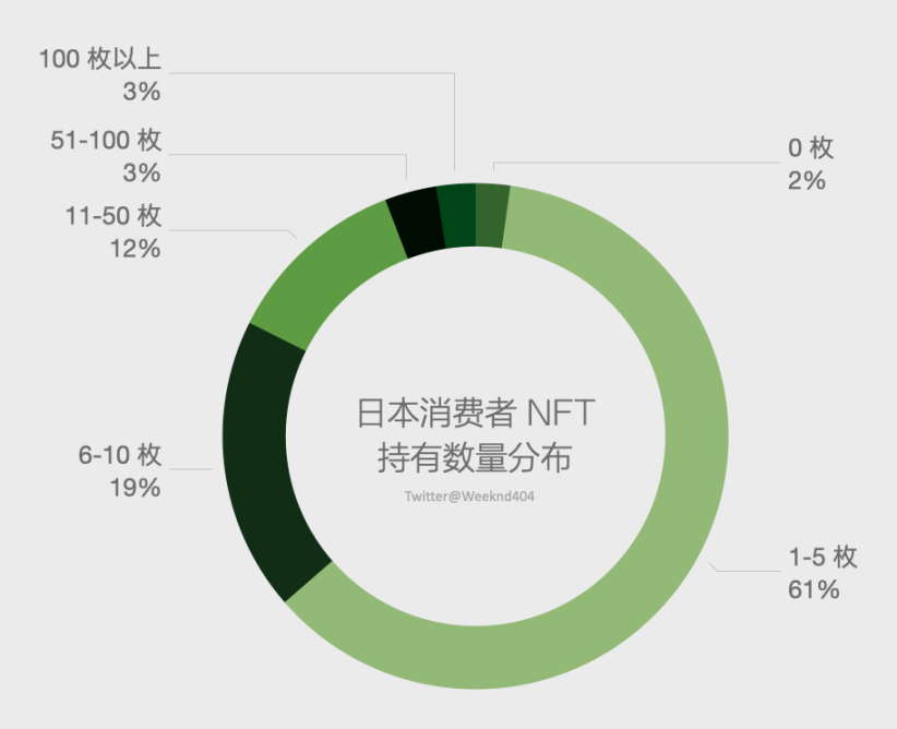 日本消费者持有 NFT 数量均较少,中位数仅 1 个,持有 10 个以下 NFT 的消费者占比超过 80%,呈现出很大潜力。