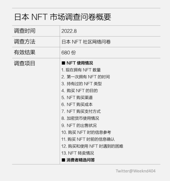 团队成员外汇哥基于其丰富的日本 NFT 经验和社群关系,联合日本本土 NFT 社群进行了网上问卷调查,获得有效问卷 680 份。由于目前日本 NFT(PFP 向)用户数量相较于 7 月份已翻了一番,调查结果已经可以较大程度上提取出日本消费者的普适性特征。