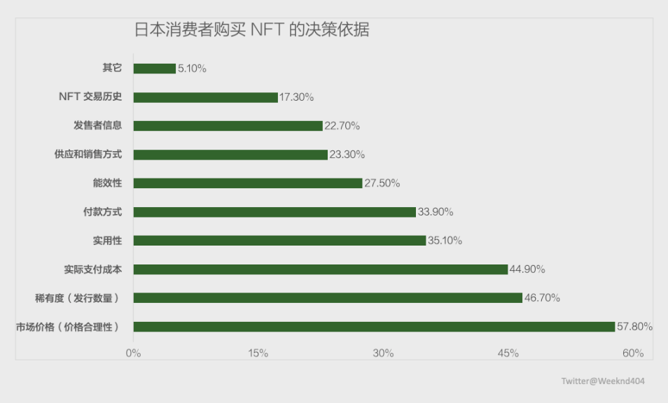 前三大目的分别为收藏、追求利润、利用 NFT 的权益,意味着日本用户的购买倾向更注重实用性,尤其是追求利润和收藏是在一定程度上形成因果关系的。