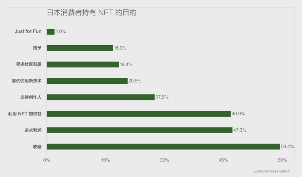 大部分日本用户入场都是从现实应用性的角度入场,而从纯 Web3 概念入场的用户占比较少,反映出明确的用户倾向性。4、持有 NFT 的目的