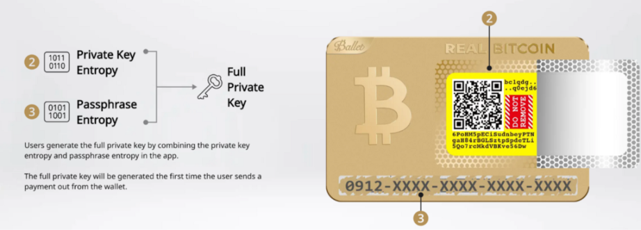 The private key components consist of the passphrase entropy and the private key entropy. The passphrase entropy is located along the bottom border of the face of the wallet, but underneath a scratch-off material placed on during production. The private key entropy is located underneath the top QR code sticker in a two-layered QR code sticker setup. This two-layered QR code sticker will leave off a honey-comb pattern on the bottom layer, indicating that the bottom layer has been revealed.