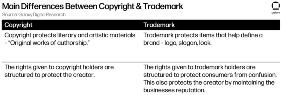 上面列出的第二项权利(发行权)赋予了版权人发行其版权作品副本的专有权,包括在商业领域,禁止他人参与任何此类发行。然而,版权人对其版权作品的这种独占发行权受到一个重要的限制 —— 首次销售原则(“FSD”)的制约。根据 FSD,当版权人将其版权作品的特定合法副本的所有权转让给第三方购买者时,其对版权作品的独占权就会终止。在数字作品方面,FSD 有一个例外。根据《版权法》,FSD 不适用于任何通过出租、租赁、出借或其他方式从版权人处获得副本或录音制品使用权但未获得所有权的人。由于 FSD 不适用于租赁,因此在过去 30 年中创建了一个完整的知识产权架构,用于许可(而不是出售)数字作品,以允许版权所有者保留其对版权材料分销的垄断权。因此,当在 Kindle 上购买电子书或在 Apple TV 上购买电影时,只是购买了在销售条款和条件中规定的特定条件下使用该产品的许可。由于电子书籍和电影不是有形产品,存在于数字领域,因此这些商品的原始所有者更容易限制使用和扣留知识产权,特别是当颁发许可的平台由发行人控制时(亚马逊、苹果)。显然,数字世界中缺乏 FSD 实施使得真正所有权的概念变得极其复杂,尤其是在涉及 NFT 时。这一点很重要:大多数 NFT 购买者相信,当他们购买 NFT 时,他们拥有 NFT 所指向的内容。在本报告中,我们观察了几个顶级 NFT 集合,发现绝大多数项目实际上没有对出售给 NFT 持有者的内容授予独特的所有权。有好几个项目在赋予 NFT 购买者所购买内容的知识产权(或版权)权利方面极具误导性。一些项目甚至明确声明 NFT 持有者 “拥有” 内容,但随后在其服务条款中否认这一事实。版权和商标