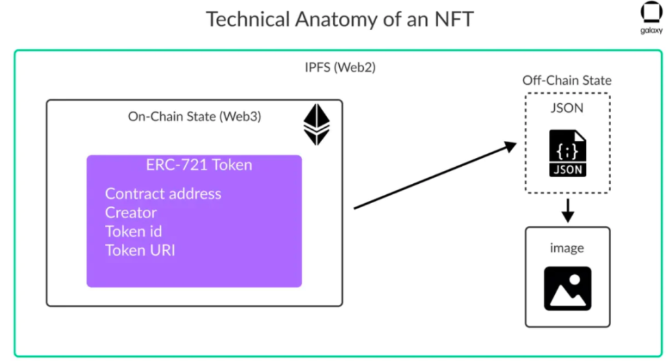 从根本上说,与所有数字资产一样,非同质化代币只是写在区块链上的几行代码。NFT(如 Bored Ape Yacht Club NFT)与可替代的代币(如 LINK、UNI 或 WETH)的区别在于,前者受 ERC-721 标准管理,而后者则受 ERC- 20 标准管理。ERC-721 标准规定了代币必须遵守的某些标准才能使其 “非同质化”。在这些标准中,最重要的两个是 tokenID(创建代币时生成的唯一标识符)和合约地址(本质上是生成代币的智能合约的地址)。这些数据以及其他数据(如 “原始创建者”、“所有者” 和 “tokenURI”)作为元数据存储在链上。通常与此处特别相关的 ERC-721 代币相关联的第三个元素是 tokenURI,它是包含指向存储在网络上的 JSON 对象的链接的元数据,它本身包含一个 IPFS 链接的 URL,与 NFT 相关的数字内容存储在这里。正是 tokenURI 为 OpenSea 和 TwitterBlue 等协议提供了关于如何显示与 NFT 相关的 “艺术”的说明。