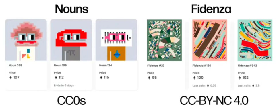 到目前为止,我们所观察的所有许可都对被许可人使用和享有版权材料施加了一系列有利于版权持有人的限制。相比之下,相比之下,CC0 许可证对被许可人使用和享受受版权保护的作品没有任何限制。通过采用 CC0 许可,版权持有人有效地承诺在法律允许的最大范围内放弃其版权作品的所有版权和相关权利。因此,该作品实际上被 “奉献”给了公众。几个著名的 NFT 项目采用了 CC0 许可,结果喜忧参半。尽管 CC0 模型相对于上述现有许可制度无疑具有优势,但也存在明显的缺陷。在收益方面,受 CC0 管理的 NFT 的持有者在将 NFT 商业化或以他们认为合适的任何方式使用它们方面没有任何限制。在 NFT 艺术收藏的所有权方面,CC0 管理的 NFT 持有者与 NFT 项目的创建者处于平等地位。尽管 CC0 管理的 NFT 可能通过将 NFT 项目的所有者与 NFT 持有人置于平等地位而使 NFT 持有人受益,但它们也使 NFT 持有人与非持有人处于平等地位。因为一旦艺术作品进入 CC0,就没有人 “拥有” 该艺术作品,这意味着任何人都可以使用。这对 CC0 管理的 NFT 的价值支撑提出了一个问题:当 NFT 项目都不能排除非持有者利用与你的 NFT 相关的艺术时,你为什么要花大价钱买一个?出于这个原因,许多人认为 CC0 许可对 NFT 存在问题,因为它使任何人都可以在不拥有 NFT 的情况下使用受 CC0 管理的图像。CC0 NFT 持有者可以将他们的 NFT 商业化,但其他人也可以。如果 CC0 NFT 持有者决定将艺术品商业化,他们也将无法合法保护这样的商业化,他们不拥有版权,无权排除他人使用相同的图像。“lil nouns” 项目就是一个完美的例子,Nouns DAO 和 Nouns NFT 的持有者都无法对 Lil Nouns 或其 NFT 的持有者执行任何形式的版权侵权索赔,因为 Nouns 是在 CC0 下发布的。在考虑版权持有人和买方之间的动态关系时,CC 的功能与 CC0 相似。不过并非所有的 CC 都是以同样的方式构建的,其变化通常来自于商业和修改权。目前,CC0、CC-BY、CC-BY-SA 和 CC-BY-ND 是唯一允许商业使用的 CC,而且除 CC-BY-ND 外,所有 CC 都允许创作衍生作品。