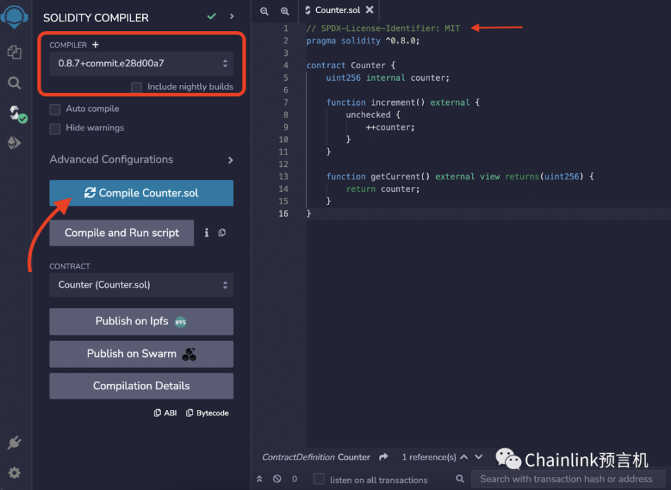 在“Solidity Compiler”下,选择 Solidity 的编译器版本(可以是任何 0.8 的版本),然后点击“Compile Counter.sol”。在这个例子中,我们会使用 0.8.7 版本。