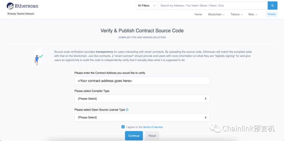 现在,当我们到 Etherscan 的验证页面后,像上次操作一样,选择:
