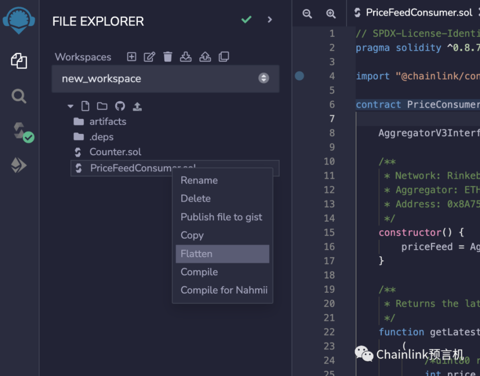 在成功部署以后,回到 Remix IDE,找到“PriceFeedConsumer.sol”,右键点击,然后点击“Flatten”。