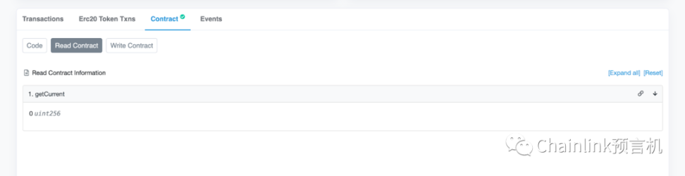 点击“Read Contract”按钮,你应该可以调用“getCurrent”函数,然后看到 counter 这个变量的值,现在是默认值 0。