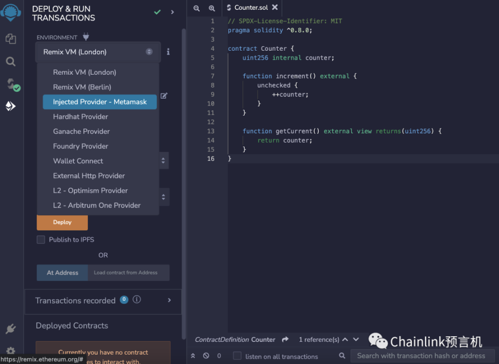 在成功编译以后,到“Deploy & Run Transactions”下面,在“Environment”的下拉菜单中,选择“Injected Provider - Metamask”,它会自动链接你的 Metamask 到 Remix IDE。在此之后,你就可以在钱包中选择你要部署的区块链网络。