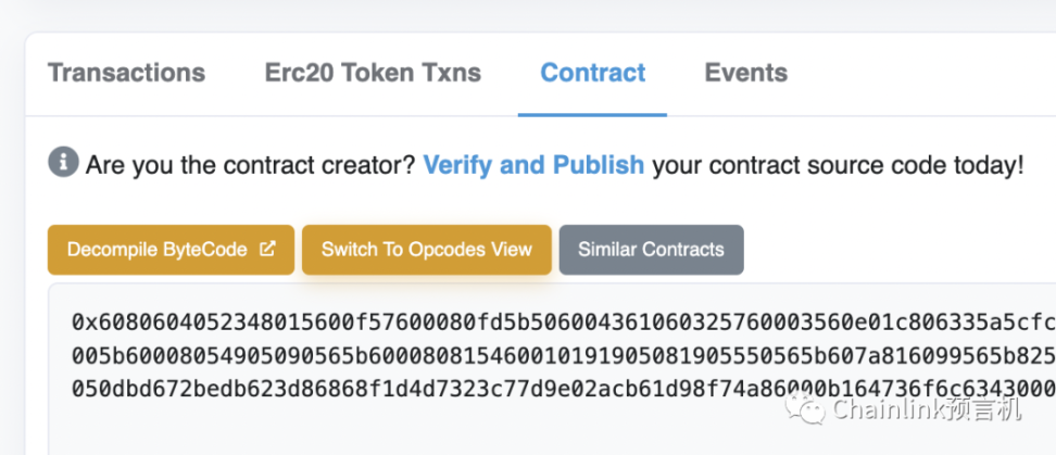 现在,可以通过交易哈希或者合约地址在 Etherscan 上看到我们刚部署的合约。如果我们现在在 Contract 之下查看合约,只能看到 Bytecode,这意味着我们需要验证我们的智能合约,然后才能在 Etherscan 上使用它。