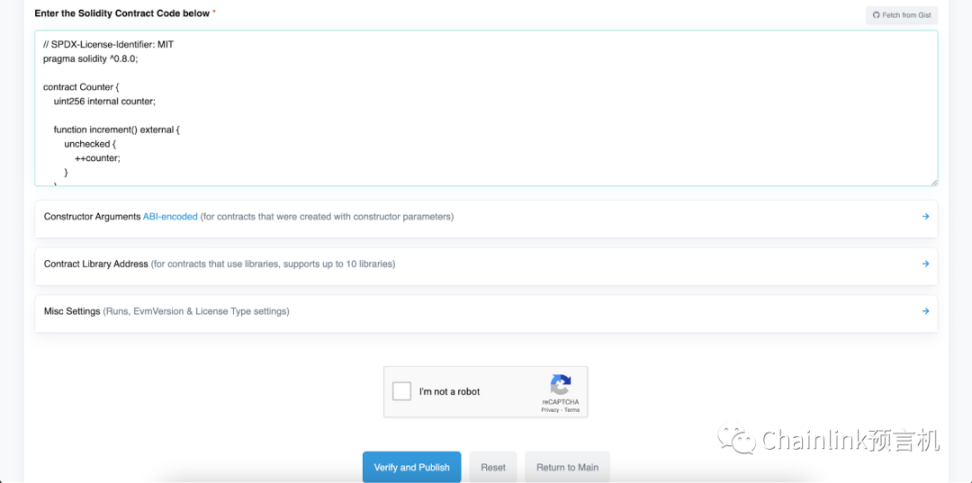 在接下来的页面,在文本框“Enter the Solidity Contract Code below”中,粘贴“PriceFeedConsumer_flat.sol”文件。