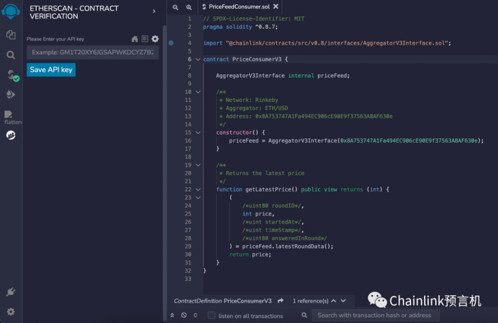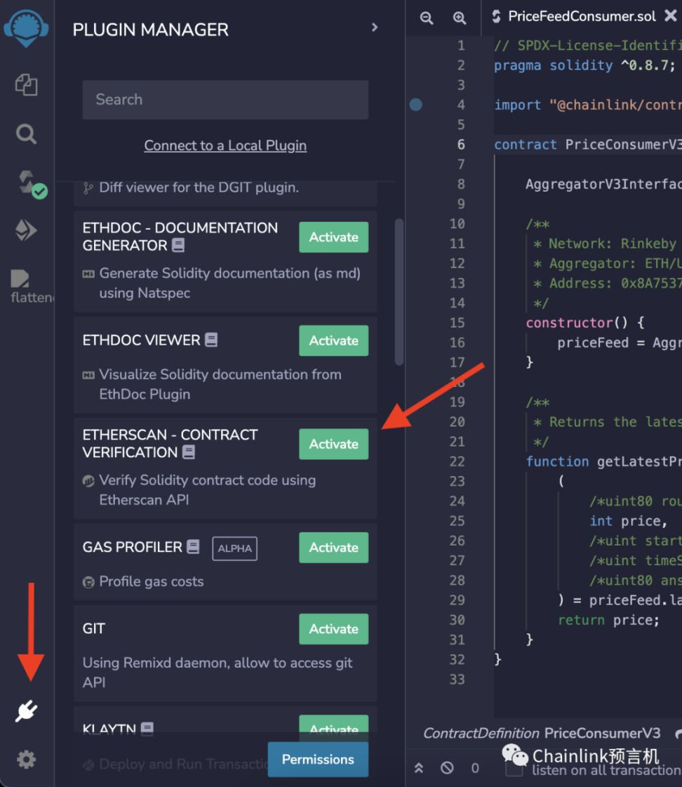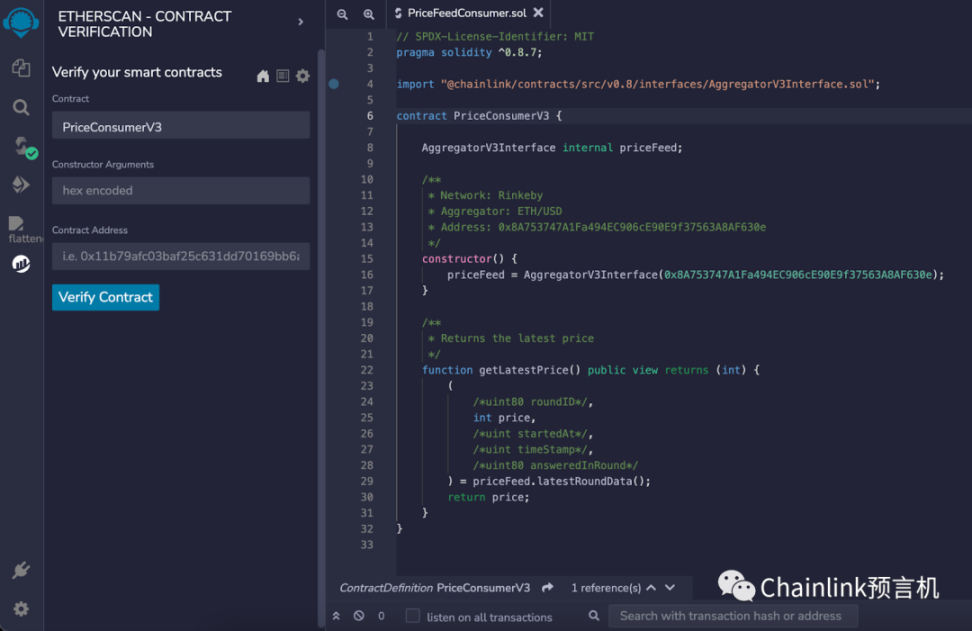 我们使用已经写好的“PriceFeedConsumer.sol”合约,再次部署它。在此之后,在 Extension 中激活 “Etherscan – Contract Verification” 插件。