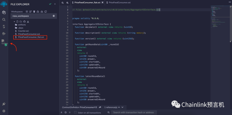 这个命令会生成一个新的文件叫做“PriceFeedConsumer_flat.sol”,这个文件将会把所有的 import 都换成被引入合约,接口或者库的源代码。