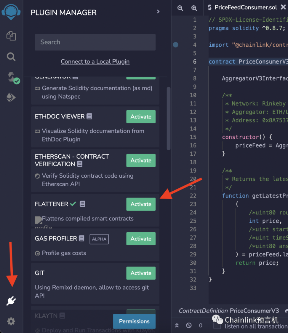 可以注意一下 Remix IDE 有一个 “Flatten”的页面,会被自动激活。第二种将合约 flatten 的方法就是点击左下角的“Extension”按钮(在“Settings”按钮之上,样子是一个电源插头)然后点击“Flattener”旁边的绿色的“Activate”按钮。