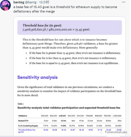 关于以太坊是否成为通缩型资产,Yearn 核心开发者 banteg 发推表示,以太坊 Base Fee 达到 15.43Gwei 是合并后 ETH 供应变得通缩的门槛。