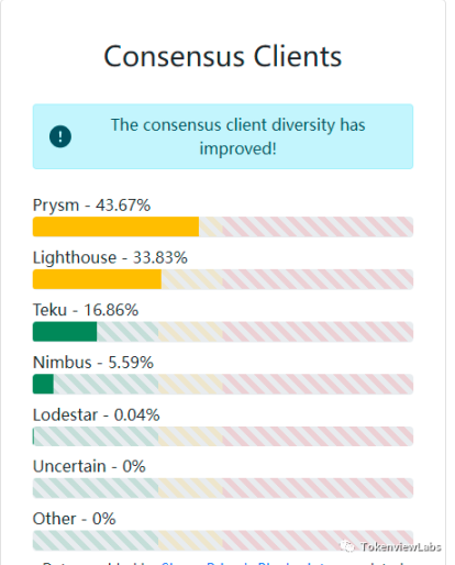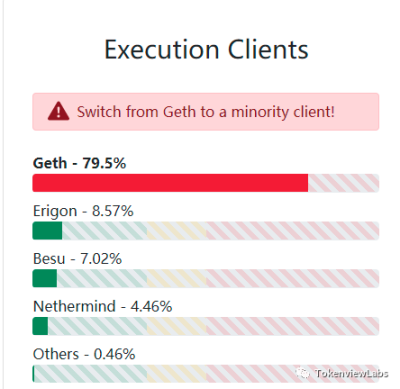 另外我们需要注意的是如果在某个特定的客户端上运行太多的节点,一旦客户端出现错误,那么运行该客户端的所有验证者都会受到惩罚。所以我们也应当注意以太坊执行层和共识层客户端的多样性。当前共识层客户端分布有了很大的改善。但执行层依旧受到挑战。Geth 仍然是大多数节点所依赖的客户端。也就是说如果 Geth 出现严重错误,那么在执行层上所有使用它的验证者都将面临惩罚。查看:以太坊客户端多样性