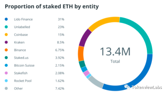 按照实体数据分析后发现,一小部分实体控制着很大一部分质押的 ETH。据相关数据表明,最大的合并质押提供商 Lido DAO 以 31% 的份额占质押 ETH 的最大数量,这主要得益于与 Aave 的关键集成,它们使 Lido 被推到了验证者的顶端。此外未标记的验证者持有 23% 的 ETH。三大加密货币交易所占质押 ETH 的近 30%,即 Coinbase、Kraken 和 Binance。