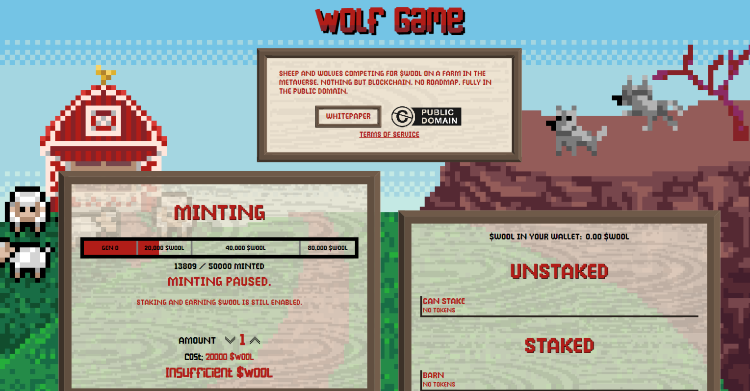 Wolf Game是基于元宇宙的NFT风险协议。共有50,000枚NFT可供玩家铸造,这些NFT包括“狼”和“羊”。玩家有90%的概率铸造“羊”,有10%的概率铸造“狼”。