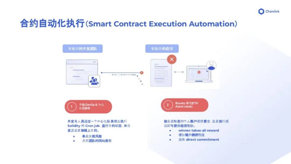 正如智能合约无法主动获取外界数据一样,也无法自己触发自己。在没有自动化工具之前,智能合约都是由开发者手动触发的。对于小型项目方,需要自己在服务器上写一段脚本,每次通过私钥去触发合约交易,这样不仅存在曾经提到的单节点风险,并且会占用团队的时间和资源。