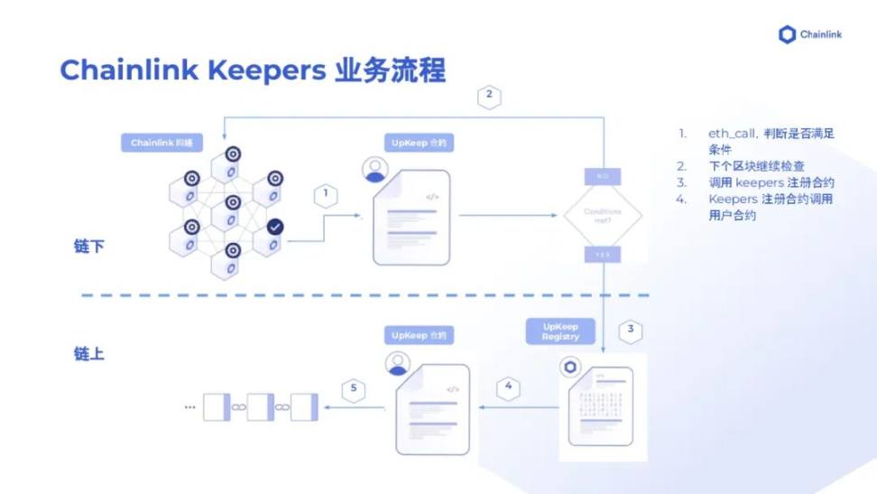 Chainlink Keepers 可以在不需要输入的情况下,不断地根据预设的逻辑去检测智能合约的状态,如果满足的话就执行,不满足的话,等待下一次检测。