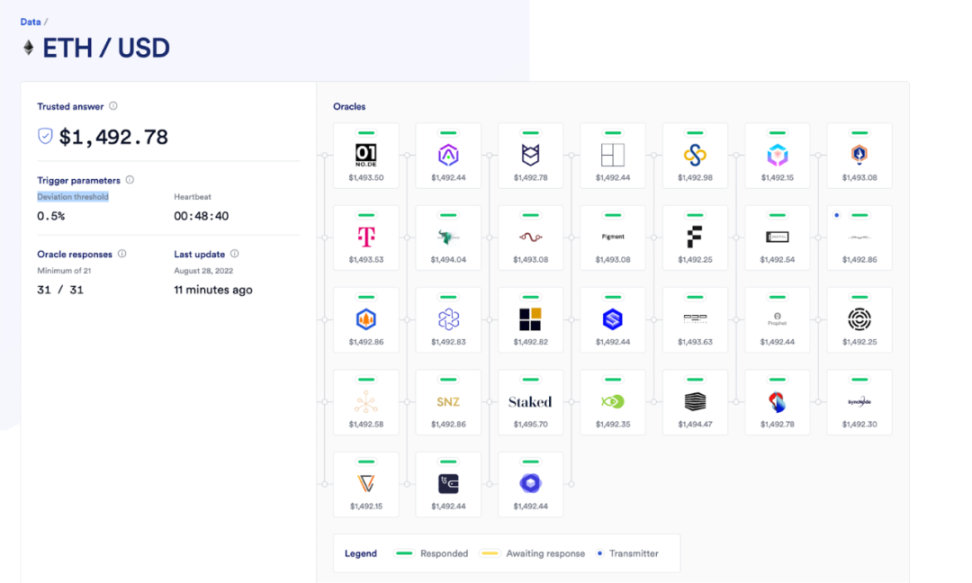 从上面还可以看到提供价格数据的节点信息,包括节点的数量,节点提供的价格数据,以及节点运营商。可以看到很多大型机构参与了 Chainlink 预言机网络,包括 T-Mobile、SNZ、SyncNode 等,后续 Chainlink 还会进一步扩大合作机构,提供更加稳定和安全的去中心化的喂价服务。
