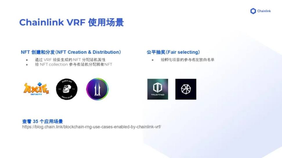 另一个应用是抽奖。比如一些 IDO 平台,用户购买通证,然后去质押通证,平台会赠送白名单参与抽奖,奖励的大小就可以使用 VRF 进行选取。