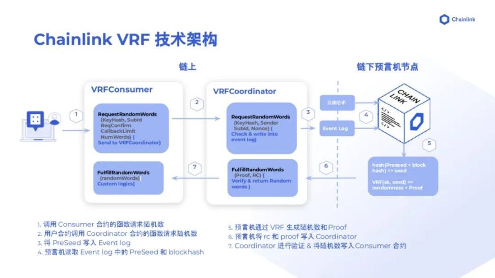 VRF 这三个函数就是使用 Chainlink VRF 的三个步骤。预言机节点生成密钥对时,会把公钥公布并且保存在链上验证合约中,私钥保存在节点内部。之后用户发起一笔交易到 VRF 链上合约去请求随机数,合约在区块中生成 Event Log,并在其中记录用户传入的种子。预言机节点监听到这个 Event Log 后,生成随机数和 Proof 发回给 VRF 链上合约,合约验证通过则写入随机数到用户合约,否则不写入,这就是整个 VRF 的实现过程。