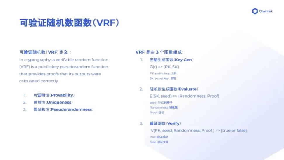 3)第三个是验证函数。节点把随机数和 Proof 返回给链上合约时,链上合约根据节点公钥、种子、生成的随机数、Proof,验证随机数是不是使用随机数生成函数生成的。验证成功返回 True,验证失败返回 false。