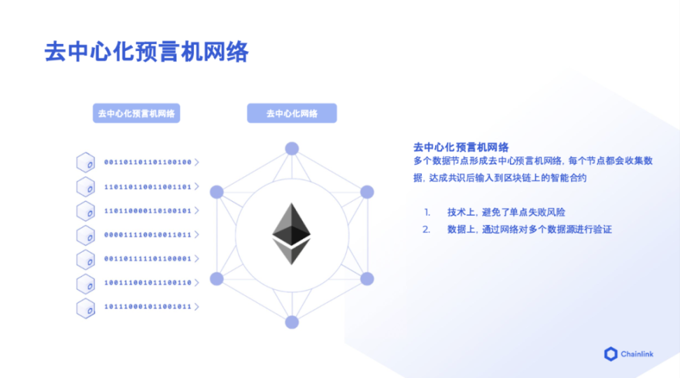 Chainlink 把预言机通过去中心化的网络,在技术上避免了单点失败的风险。如同以太坊节点,当一个节点中断或者退出时,不会影响到整个网络的安全性和可用性。另外在这个数据上,由于采用多种数据源,所以不会被一个单方面数据源所操控,充分地利用了去中心化的优势。