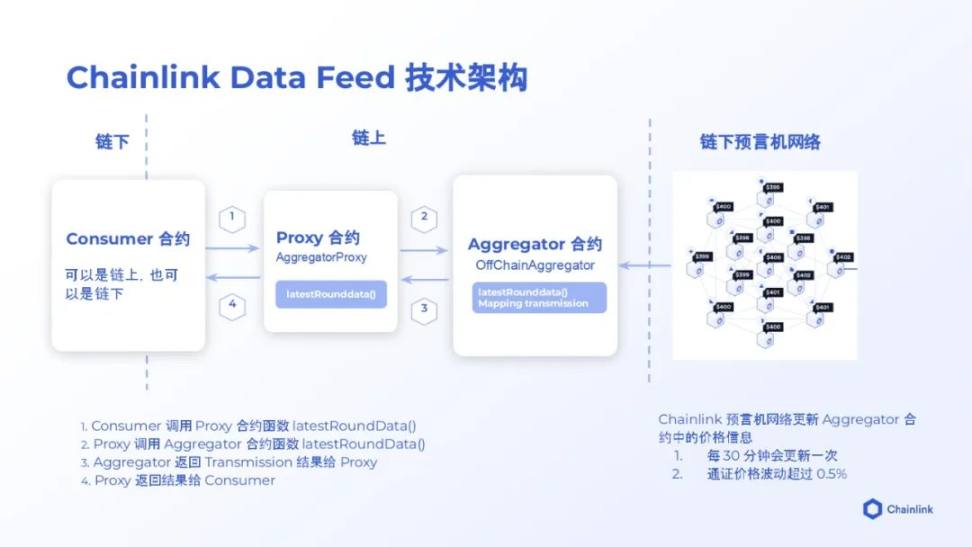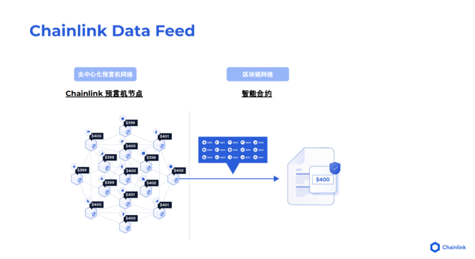 在 Chainlink Data Feeds 中,不同的预言机节点,通过自己的数据提供商获取价格数据,然后通过预言机网络对多个数据聚合后。比如一个 token 价格,A 节点报价是 $400,B 节点报价是 $399,C 节点报价是 $401,预言机节点将所有的报价进行共识后,会把价格中位数 $400 传给链上的智能合约,完成此次喂价。