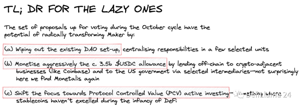 今天投票有什么进展→我们的注意力不是明天或终局游戏的复杂性,而是今天实际投票的内容,提醒我们即将到来的投票周期已经到来,其中大多数是基本提案其中的作者(或至少是祖父)由 Rune — Maker 的创始人。它们的影响非常非常深刻。本着科学治理分析的精神,我决定只关注已提出投票的内容,因为已经有足够的内容表明该协议的新目的地可能是什么。如果您是 $MKR 持有者,我建议您注意。