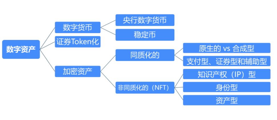 美国现在越来越重视和使用数字资产概念。综合目前讨论看,数字资产至少可以分为 3 类:数字货币,证券 Token 化,以及加密资产(图 4)。因为要有效履行货币基本职能,数字货币主要包括央行数字货币和稳定币。证券 Token 化主要是国内外证券交易所在研究。加密资产分为同质化(FT)和非同质化(NFT)两类。FT 中,有些是原生的,有些则由其他加密资产合成而来。根据美国目前在监管层面的讨论,FT 将来主要分为支付型、证券型和辅助型 3 类,其中辅助型加密资产的概念值得特别关注。NFT 则分为知识产权(IP)型、身份型和资产型 3 类。