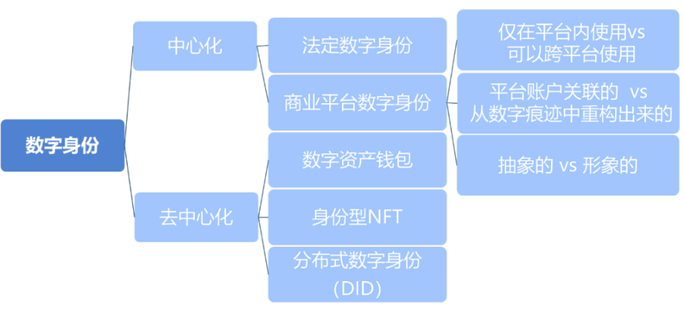 中心化数字身份包括法定数字身份和各种商业平台的数字身份。商业平台的数字身份还可以从不同维度进一步细分,包括:1.只能在一个平台内使用的数字身份,以及可以跨平台使用的数字身份(比如我国的支付宝和微信,美国的 Google 和 Facebook);2.与平台账户关联的数字身份(比如 Web2.0 网站以及各种 APP 上的账户),以及从数字痕迹中重构出来的数字身份;3.抽象的数字身份,以及形象的数字身份(比如虚拟数字人)。