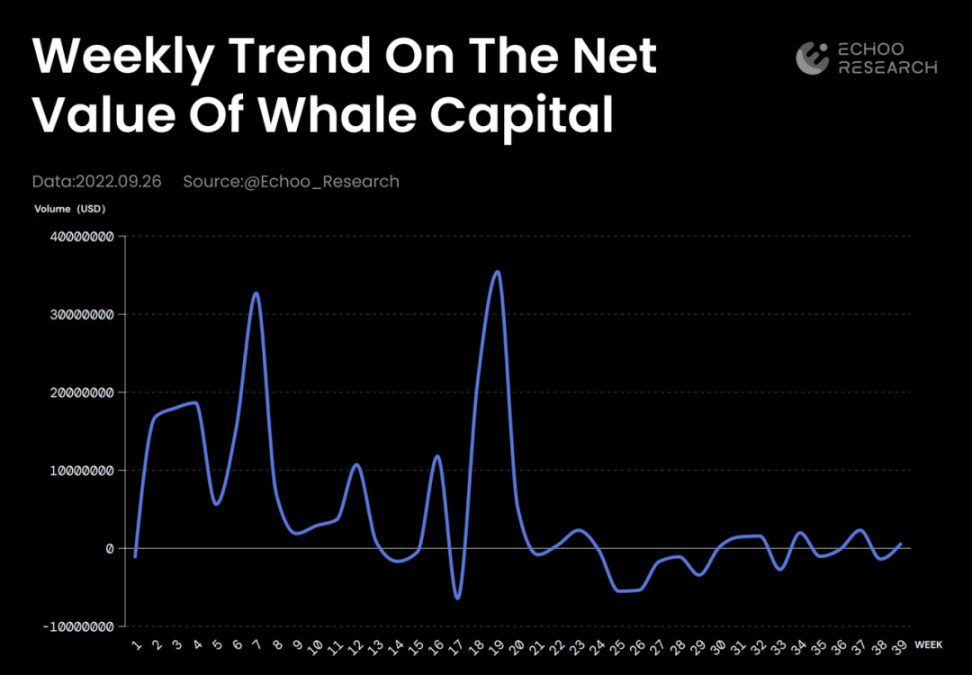 虽然当时也诞生了 Moonbirds 和 Otherdeed 等优质蓝筹,且多数用户还是觉得 NFT 市场会有新的高潮,但我们 Echoo 内部从数据发现很多巨鲸资金当时正在逃离,随之而来的就是一个缩量的过程。