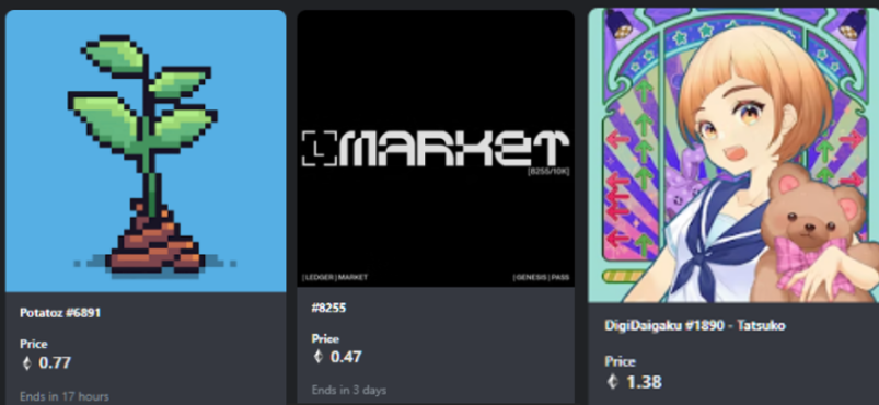 第三个是有 Web2 公司背书的项目,特征是自有流量和用户基础。如 The Potatoz,它是 Memeland 发行的 NFT,从 freemint 涨到 1 ETH 左右;还有加密钱包 Ledger ,本身就有用户基础、曝光度和业务支持。以及 DigiDaigaku,画风更偏向于二次元,它也是属于 Web2 公司背书的,且有用户基础,公司本身就有近亿美元的收入。