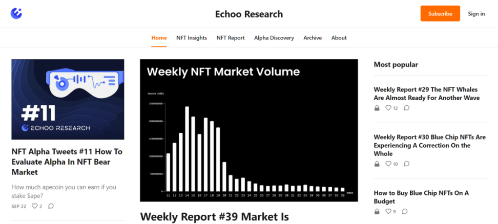 我们的主平台在 echoo.substack.com,面向于全球所有 NFT 投资人和 degener。但我们发现订阅用户中也有很多来自于国内,包括一些投资人和 Web3 builder。同时,很多国内用户私信我们希望能够有中文版方便阅读,因此我们决定和 Labs 合作,将内容嫁接到中文社区。