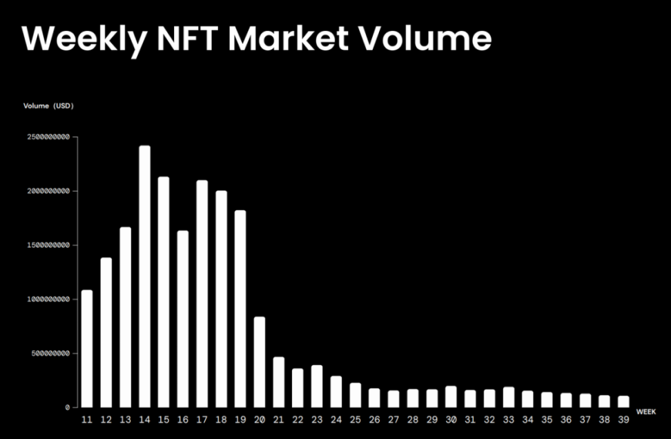 现在依然是 8 月份之后交易量下跌的延续,按照上周的情况来看,交易量当前并无太大起色,整个交易量处在历史最低区间。这个阶段大家对于 NFT 还是比较“清心寡欲” 的,也表明了大家对于未来很长一段时间熊市的共识。