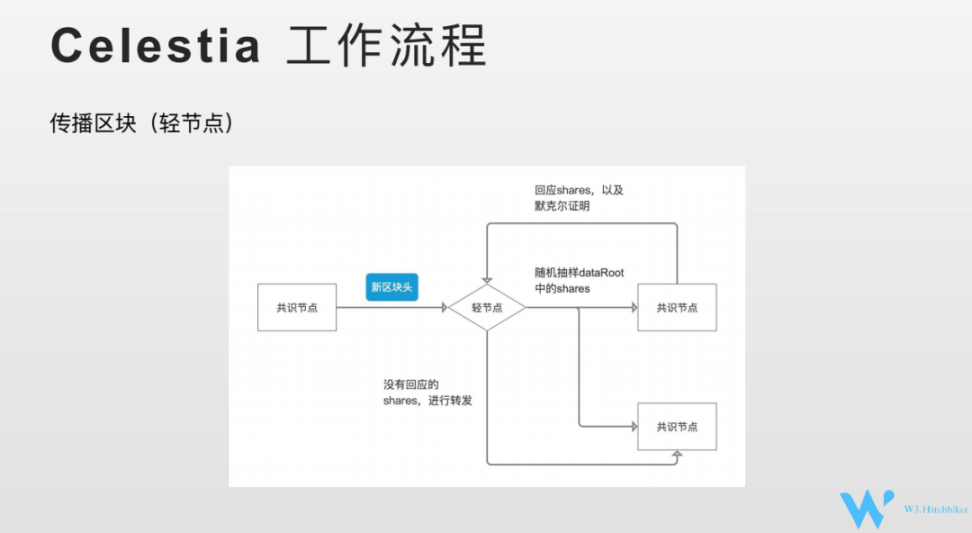 共识节点和共识节点的交互这里就不具体阐明了,P2P 的方式。DA 涉及到的是共识节点和轻节点的交互问题。不能参与共识的节点统一称为轻节点。传播主要看 DA 和轻节点之间的流程。我们看是如何交互的。共识节点经历过一段共识 ( 数据确认)之后,会产生新的区块,会把区块头,包括 data root 发送给轻节点。轻节点收到 data root 之后。就需要进行随机采样,我们看到 2K*2K 矩阵,在 2K*2K 矩阵中其中挑选一组坐标,打包成一组集合。这个集合就是本次抽样的一个集合。将抽样的集合发送给他们相连的共识节点。请求共识节点将坐标对应 shares 发送给轻节点。共识节点就有两种回复。一种我有你请求的,那么 1)shares,以及 2)shares 在 data root 中的默克尔证明一起回复给轻节点,轻节点收到回复之后,会去做默克尔证明,证明这个 shares 在这个 data root 里面的,之后就会接受 shares。当他把他的抽样都收到回应之后。这个时候就基本上认可了这个区块,认可了这个数据是可用的。Dataroot 都是链的交易,能够回应就说明了这些 Data 在网络上都是被共识节点认可的。如果某个共识节点没有回应,轻节点会把我收到的相关 shares 转发给对应的共识节点,帮助整个网络快速地收敛。P2P 网络,网络的扩大,共识节点确实收不到 / 收到比较慢共识结果。我轻节点可以通过这个机制,快速帮助对网络的传播。