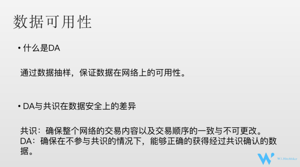 DA 官方的解释就是通过数据抽样,保证数据在网络上的可用性。数据可用性如何理解呢?回到之前的点,可以理解下之前提到过的去中心化验证。本质上就是轻节点在不参与共识的情况下,不需要存储全部数据,也不需要及时的维护全网的状态。对于这种节点,需要高效的方式确保数据可用性和准确。接下来介绍下 DA 与共识在数据安全上的差异。因为区块链的核心在于数据的不可更改。区块链能够保证数据在全网的数据是一致的。共识节点为了保证性能,会有更为中心化的趋势。其他节点需要通过 DA 获得经过共识确认的可用数据。这里的共识(交易内容以及交易顺序的一致性)与其他网络的共识(交易的排序,验证等)并不完全一致。