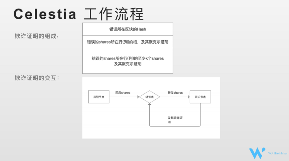 欺诈证明,为什么需要有欺诈证明,我们有了纠删码,抽样,理论上获得的数据。比如说我从十个共识节点抽样获得的数据,通过纠删码可以确定这些数据是十个节点给的。但是这个地方会有些问题,就是这十个节点都有没有给我们正确的数据,我们怎么来做呢。纠删码只能证明这些数据是他们想给我们的。但是需要验证他们想给我们的数据是否是正确,那么欺诈证明确保共识节点是按照设想规则给我们编码的。这就是为什么我们需要欺诈证明。欺诈证明就是来解决这些问题。证明节点通过抽样获得 shares,恢复的数据到底是对的,还是无效的。