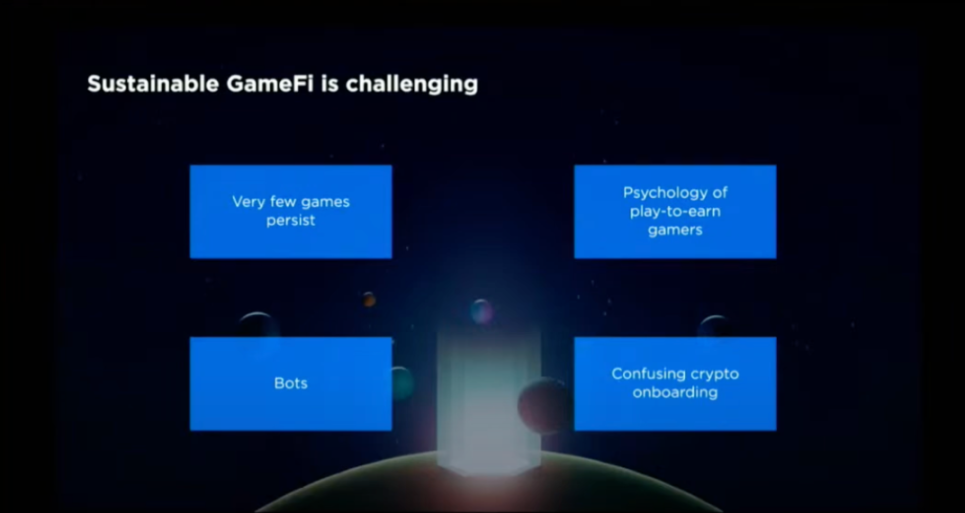 其目前的生态重点在 Gaming 这块。现在 Gamef 的问题,伪需求,不可持续性。无论是 pay to earn 以及 play to earn 都存在潜在问题。Pay to earn 为用户提高了一定的门槛,play to earn 给投机者,生态榨取者带来了巨大的价值机会。我们在之前的文章加密社区的经济和社会可持续性思考 - CFG Labs中进行了深度的解析。当然 Crypto.com 最近的报告认为:真正的游戏玩家是愿意花钱去购买相关游戏和服务的,比如 NFT 虚拟资产,道具,Web2 游戏积分等等,而本身过于强调经济激励而非从用户端切入进行产品优化本身会给生态带来过多的价值提取者,影响生态的长期发展。Axie Infinity, STEPN 的问题让我们对目前 Gamefi 的可持续性进行了深度思考。而游戏可持续的问题不仅仅来源于项目,play to earn 中激励的放大化(用户其实具有较强的愿意去购买核心资产,参与游戏,真正的游戏在链下,商业模式在链上,比如质押,比如通过行为,数据(链上 + 链下)追溯用户行为),机器人的参与(薅羊毛的人,真实用户比较少),也包括加密产品的使用 / 教育等问题。目前的 portfolios 包括链游项目 + 链游工会等。