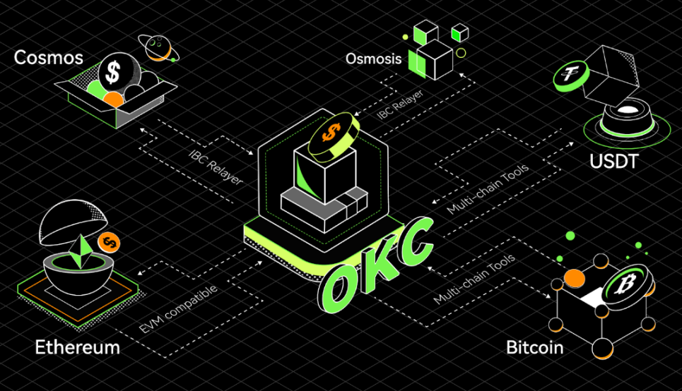 Nomic 是一个将比特币网络接入 IBC 的桥,比特币是基于 POW 的共识机制(概率确定性),所以需要通过 Pegged Zone 接入。Axelar 也是桥这块的重要玩家。而 OKX 将用一些 Multi-chain 的工具将比特币网络接入 OKC。我理解应该是基于 wrapped 资产的形式接入。