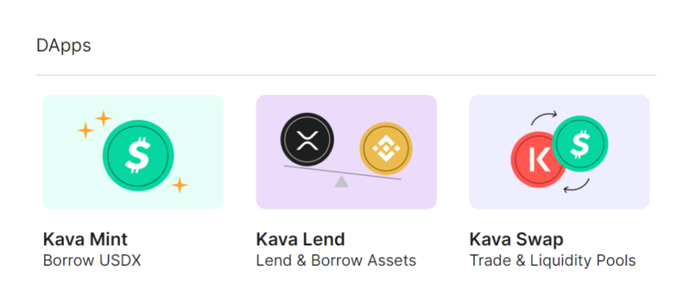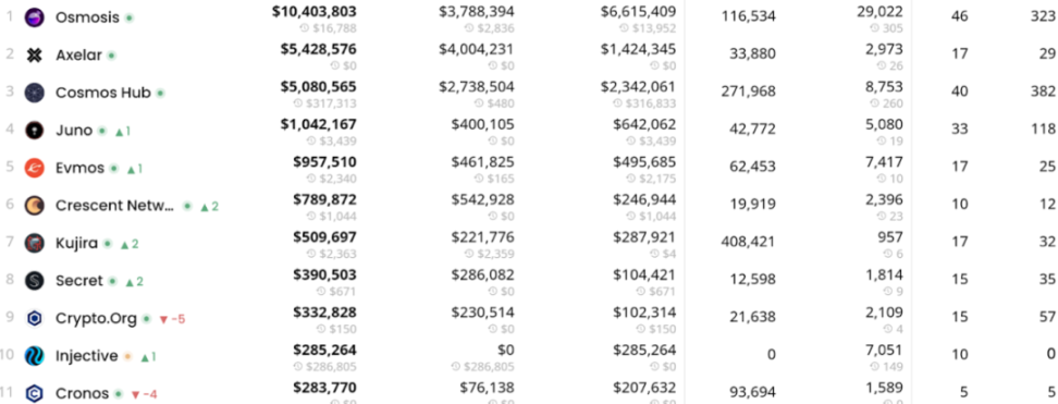Kava 是币安进入 Cosmos 生态很重要的合作方(当然也包括 Terra, Band 等),目前币安的主流资产都在 Kava 上。包括 Mint, 借贷,交易等。Kava 是一条非常有特色的 Cosmos 生态链。截止最新数据,按照交易量排名第 12 名。1)很早接入 IBC 2) 在 19 年参与 Defi 3)基于 Ethernint 开发了以太坊兼容链。