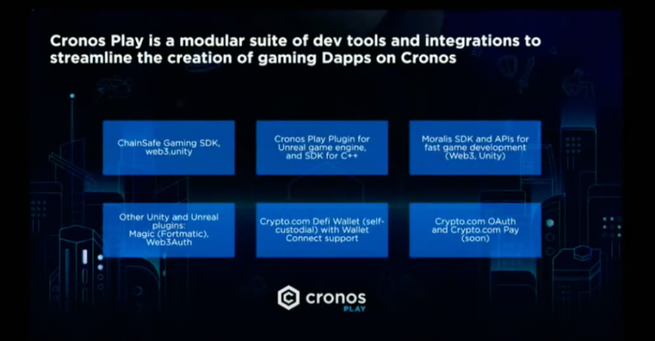 在基础设施层面,Cronos 也做了一系列开发工具,帮助开发者在链上搭建应用, 这里主要指游戏。钱包,基础设施,API 服务,SDK 插件等。