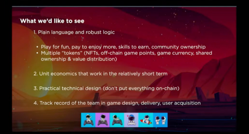 Hongyi: W3.Hitchhiker: 听下来很有收获。我想补充下 Gamefi 的问题。目前消费型的游戏玩家对区块链还是非常抵触的。之前模仿我的世界游戏,也出了些 NFT。官方表明并不支持该活动。所以要实现这个愿景还是比较漫长。在这个熊市可能是最先起来的应用。