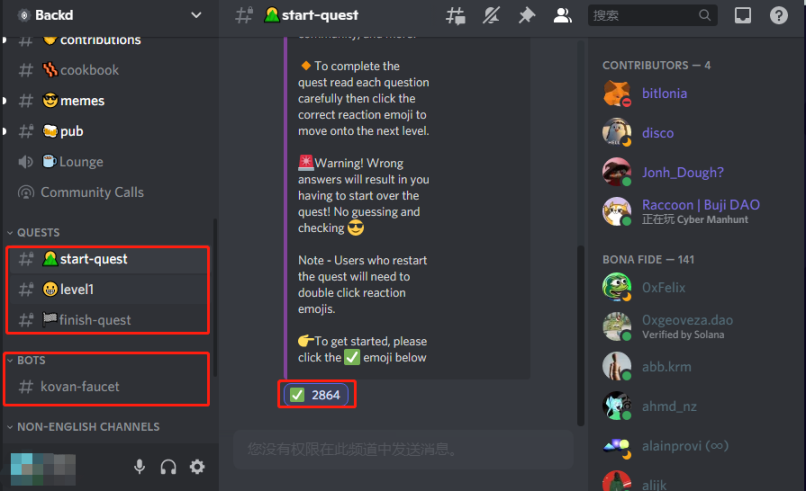如何获得官方 discord 角色:进入 discord 社区选择红框第一行所示选项点开,选择右下角红框选项表情,依次点击 leve1,leve2 直至“finish-quest”同样的操作行为即完成角色更换。要进行测试环节需要到 discord“kovan -faucet”领水输入钱包地址等待领水,完成。