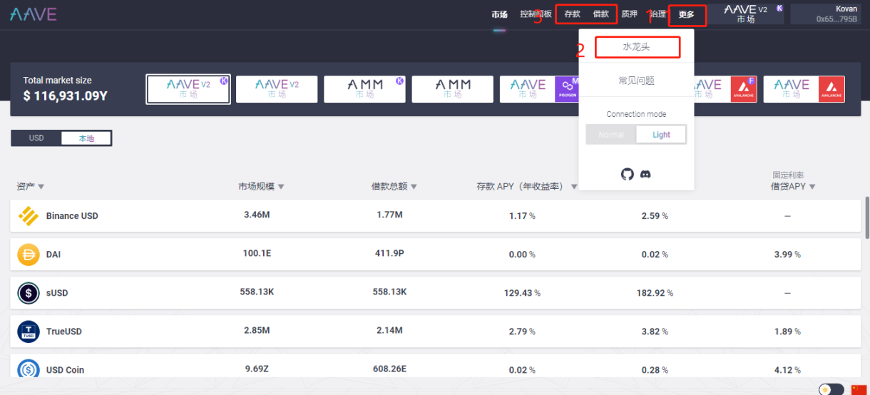 按照所示 1,2,3 步骤(先 1,2 进行领水,后 3 存款,借款)