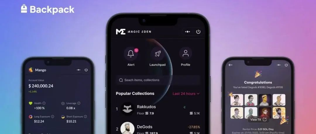 我们前面提到了 Backpack 提供了一个多边的应用市场,在商业模式上得以激励应用爆发。但是更关键的是如何为开发者创造更加丝滑低门槛的开发环境。Backpack 对于开发者来说意味着他们不必接触昂贵而复杂的远程过程调用(RPC)基础设施,开发速度可以提高 10 倍。很多开发者希望只是建立创新应用,而不必设置和运行他们自己的 RPC,或向服务提供商支付高昂的 API 费用。Backpack 创建了一个平台,允许从未接触过区块链的 Web2 开发者以比以往快 10 倍的速度构建。在用户的层面来看,用户不再需要为每条链都特地使用新的钱包,而只需要在一体化的环境中进行操作。而不再把用户体验分割到多个 DApps 之上,实现更高层级的联系交互水平,在笔者看来是 Backpack 真正有可能推动网络效应演进和价值积累,成为新流量的聚集地。举个例子,用户在 Backpack 的用户可以在一体化的界面下使用 Magic Eden 上挂单 NFT,查看 Aurory DNA。在 Degods 做抵质押,在 Mango 上进行借贷,通过 Wormhole 跨链资产,使用 Psyoptions 的 Vaults 生息,以及用 Anchor 开发工具开发。Coral 声称,Solana 上 10 多个头部项目已经在使用该框架进行开发。在 Backpack 的私密测试版下,NFT 市场 Magic Eden、区块链游戏项目 DefiLand 和 Aurory,以及交易应用程序 Mango Markets 将作为 xNFT 应用程序首次亮相。除此之外,xNFT 的方式来访问 Web3 应用的一大好处在于,Backpack 构建了去中心化的 UI 层,绕开了大部分的钓鱼网站,可以避免大多数钓鱼攻击。Coral 公司起初在 Solana 上创建了占主导地位的开发者框架 Anchor,这使得智能合约层面的安全性和开发效率有了质的飞跃。如今,Coral 的 Backpack 横空出世,提供了一个去中心化、安全和协同合作的开发生态,从长远来看是为 DAPP、Solana Pay、移动开发和钱包适配问题提供一个测试平台。将为 Solana 生态乃至 Web3 世界走向移动端发展提供一片润土。