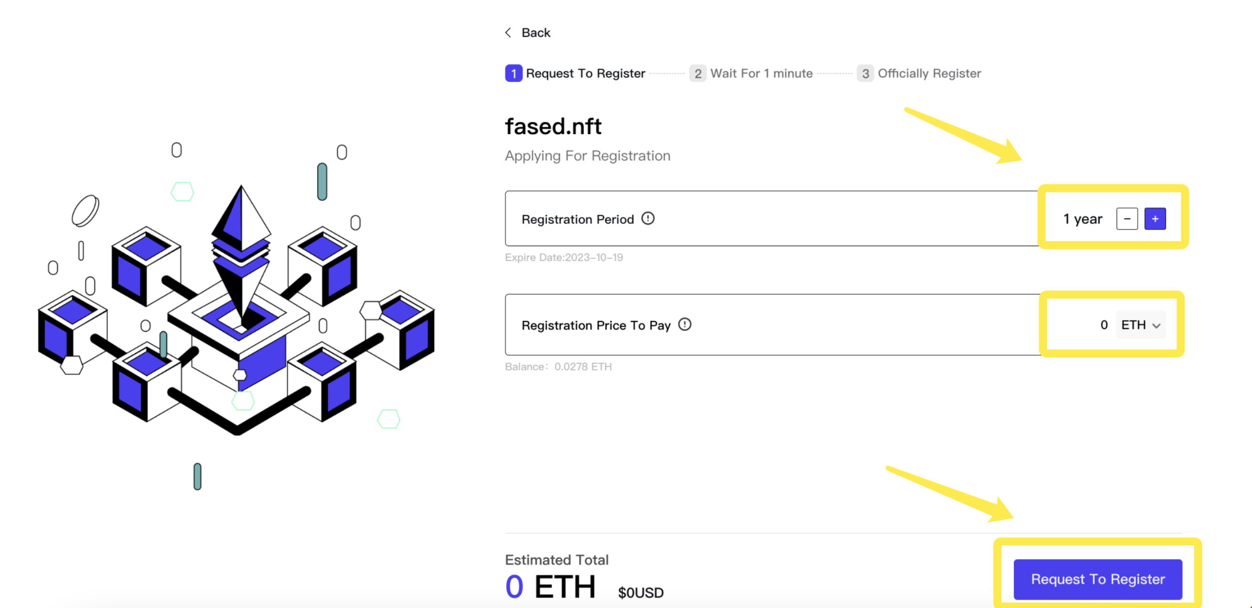 3. 在下图界面,先选择注册年限(点击“+”可选择注册 2 年及更多年),然后点击Request To Register